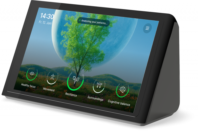 Isa works with a intelligent 3D sensor and a locally running AI. Among other things, the system recognises posture, movement, light, air quality, volume and drinking behaviour - without processing personal data. Isa uses this information to create an individual stress profile and provides brief, everyday suggestions for healthier behaviour in the workplace - completely automatically and without an app.
